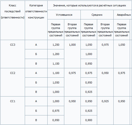 Государственными строительными нормами ДБН В.1.2-14-2009 «Общие принципы обеспечения надёжности и конструктивной безопасности зданий, сооружений, строительных конструкций и основ» (табл. 5, пункт 7.6.4.) предусмотрено, что коэффициент надёжности за ответственностью (коэффициент ответственности) определяется зависимо от класса объекта и типа расчётной ситуации (в диапазоне от 0,95 для класса последствий СС1 для категории ответственности конструкций «В» до 1,25 для класса последствий СС3 для категории ответственности конструкций «А»).